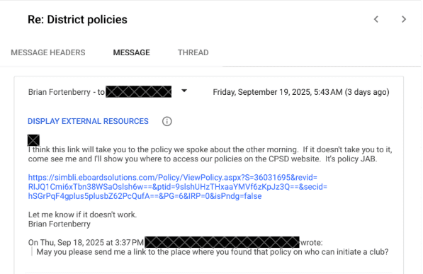 Again pressed by a student on Thursday, September 18th for a policy prohibiting the formation of the club, Dr. Fortenberry sent the only email of his produced by Clinton Public Schools on Friday, September 19th, citing the policy against teacher-led organization. This came a day after the issue went public and the same day of the District’s statement. This email also confirms intermediary verbal communications.
