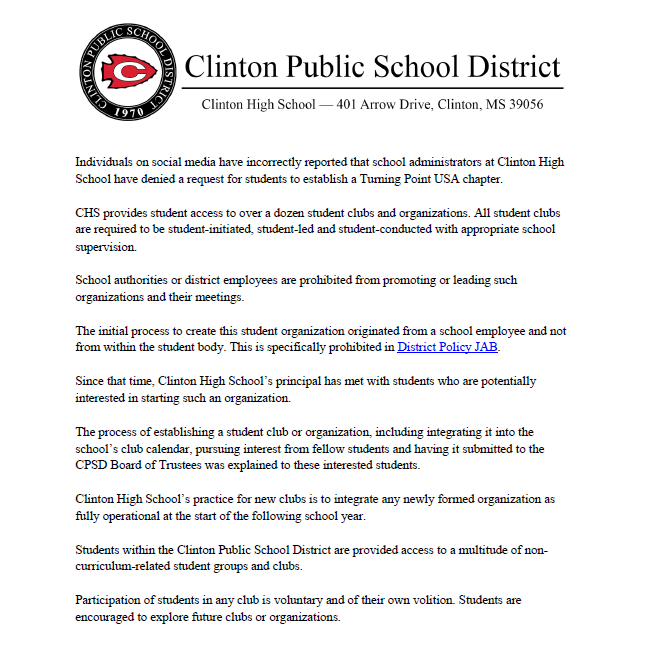 Instead of sending answers to these questions, the Clinton Public School District put out a statement. While it did not reference us by name, it indicated that our social media posts were “incorrectly reported.” Then the District’s statement, ironically, proceeded to explain why the effort to form the TPUSA chapter had, in fact, been stopped this year. It offered the latter two of the three reasons that Magnolia Tribune had originally been supplied by our sources: