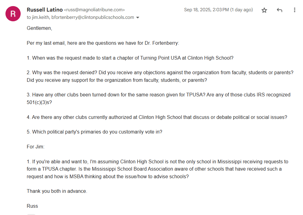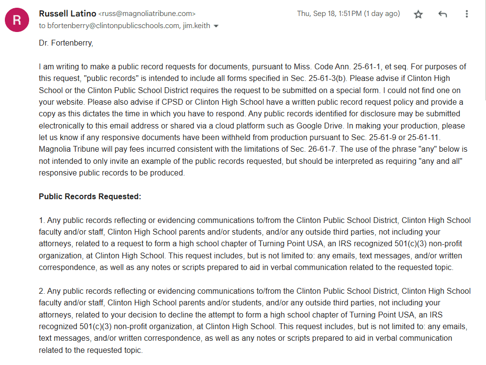 The Clinton School District, in a partial response to the public record request served by Magnolia Tribune on September 18th, provided screenshots of emails between a member of its faculty and students about the potential of starting a Turning Point USA club. The teacher’s email noted that she was reaching out to the students identified because of interest they had expressed in similar ideas (“patriotism and healthy debate”) and that “the initiative to start the [Turning Point USA] chapter would need to be student led.” She invited the students on the email to share it with others “who might be interested in spearheading this kind of club at the school.”