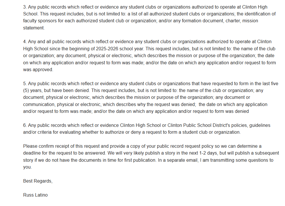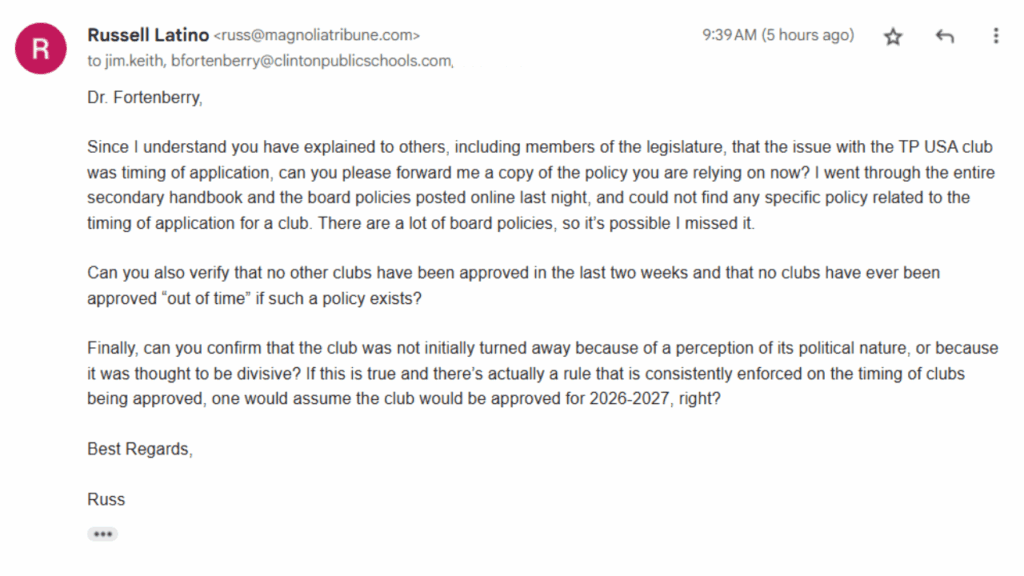 And when the Clinton Public School District partially responded to our public record requests — which included a request for any written policy they were relying on — a written policy was not produced related to club approval and timing.