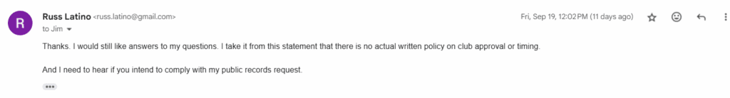 When Keith sent us a copy of the District’s statement on September 19th, I replied: “I take it from this statement that there is no actual written policy on club approval or timing.” He did not respond to this point.