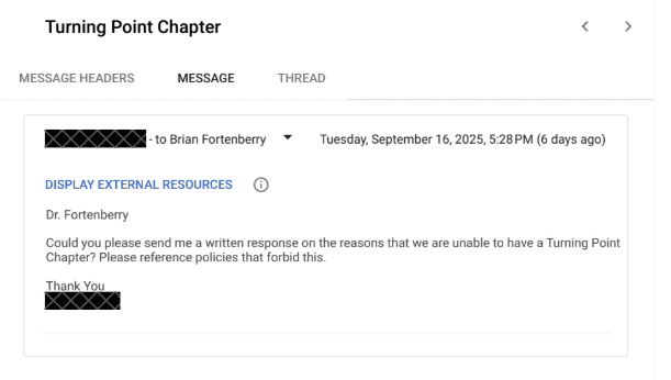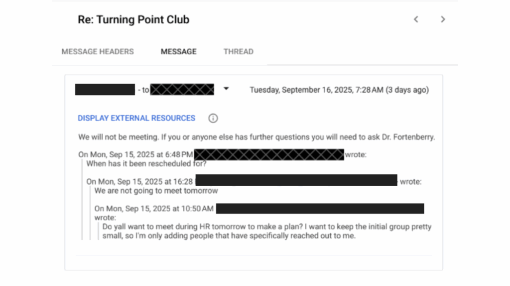 On Monday afternoon, September 15th, the teacher abruptly informed the students they would no longer be meeting. In response, a student asked when the meeting would be rescheduled. The following morning, the teacher advised that the meeting would not be rescheduled and students interested in the club should speak directly to Dr. Fortenberry.