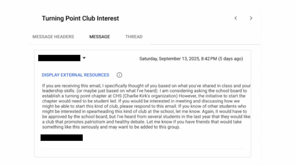 A third source told Magnolia Tribune that the teacher’s email became widely circulated and not everyone who received the forward was happy with the idea of Charlie Kirk’s organization on campus. That source indicated that circulation made its way into the hands of at least one set of parents who were ideologically opposed to Turning Point USA and who voiced complaints to Clinton High’s administration, prompting school leaders to step in to shut down the effort for being “too political.”
