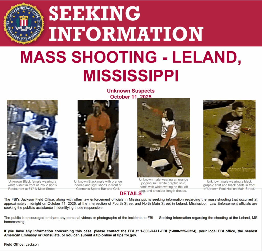 The FBI’s Jackson office posted Saturday on X, “We ask that members of the public share any information, specifically videos and photos that would assist us in this investigation, and we encourage them to please report that to the FBI at 1-800-CALL-FBI or http://tips.fbi.gov. Any piece of information could be crucial.”