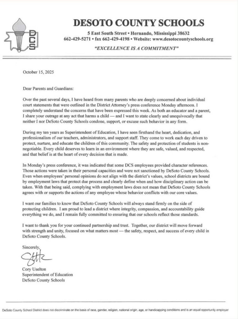 On Thursday, October 16th, the DeSoto County School Board will meet at 10 a.m. Preempting the meeting, DeSoto County Superintendent Corey Uselton released a letter attempting assuage families’ anger.