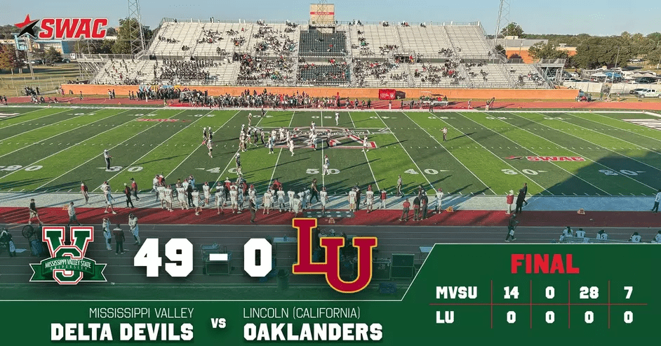 Valley Athletics said the Delta Devil defense shut out the opposition for the first time since 2008 and held Lincoln to negative 35 rushing yards, while the offense put up its most points in eight years. The last time MVSU won by a larger margin of victory was in 2009.
