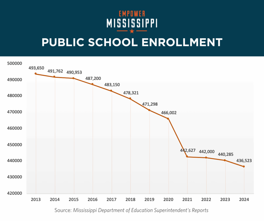 That increase looks even more dramatic when you realize that Public School Enrollment has been steadily declining during the same period. In other words, Mississippi is spending a lot more money on fewer students. That’s the opposite of “defunding.”
