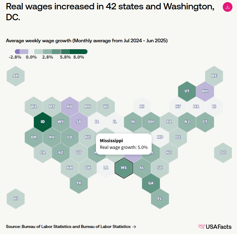 Notably, eight states showed negative real wage growth, including Mississippi’s northern neighbor of Tennessee.