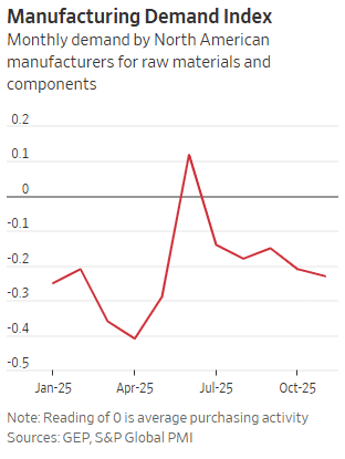 “Buying activity among North American manufacturers, measured in a global poll of 27,000 businesses by GEP and S&P Market Intelligence, in November hit its lowest level since May,” WSJ reported. “U.S. retailers and manufacturers are waiting for the Supreme Court to rule on the constitutionality of the administration’s so-called reciprocal tariffs.”