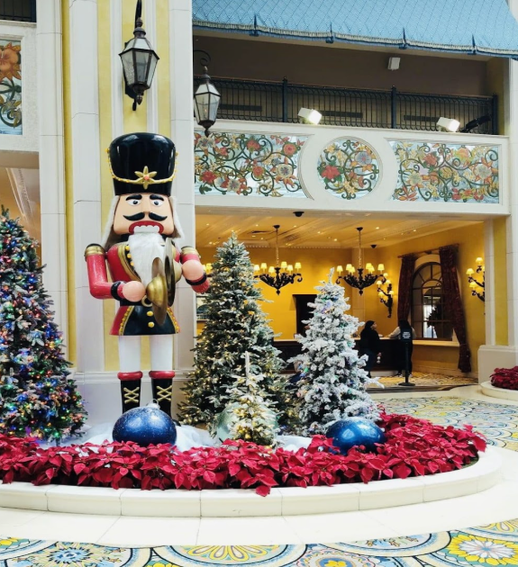 Walking into the atrium this time of year almost feels like stepping through the wardrobe into Narnia. Color, scent, and sound all arrive at once—soft, warm, and festive. Larger-than-life nutcrackers keep a cheerful watch. Frosted trees stretch upward, wrapped in tiny white lights that flicker like fireflies in summertime. And layered in the air is this blend of pine, cinnamon, and something sweet—almost like someone cracked open a tin of homemade Christmas cookies just moments before you walked in.