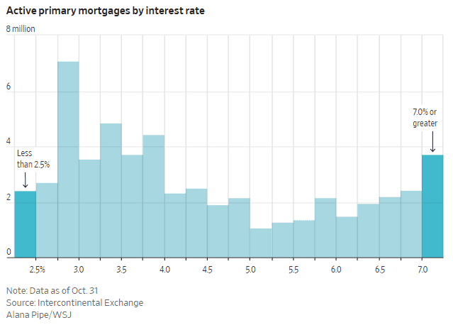 “Nearly 30 million households, or 54% of primary mortgage-holders, have mortgage rates at or below 4%. They were able to buy homes or refinance their mortgages when rates fell to 3% or lower in 2020 and 2021,” WSJ reported. “Now, many of those who want to move don’t feel it is worth it to buy a home and take on mortgage rates that have doubled.”