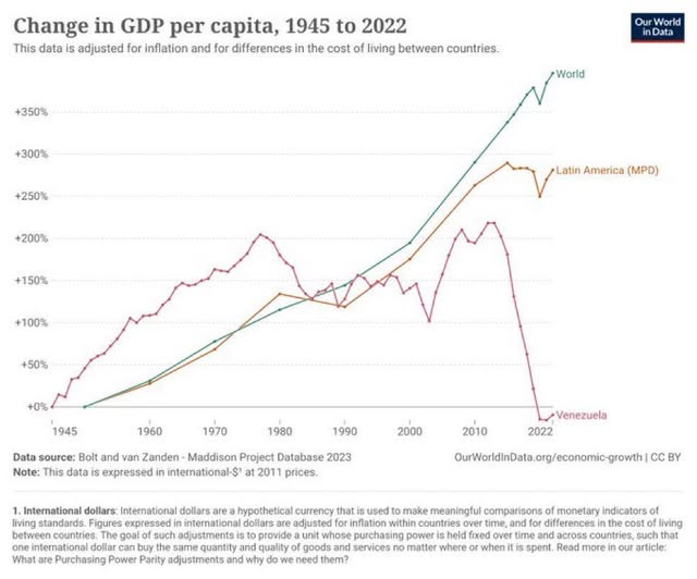 Today’s Venezuela economy is smaller than it was in 1945 at the close of the Second World War. In fact, it is only 28 percent of the size it measured just 12 years ago in 2013.