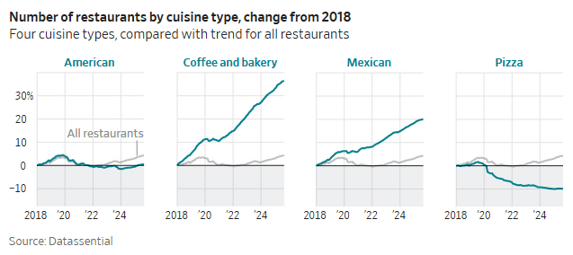 “Once the second-most common U.S. restaurant type, pizzerias are now outnumbered by coffee shops and Mexican food eateries, according to industry data. Sales growth at pizza restaurants has lagged behind the broader fast-food market for years, and the outlook ahead isn’t much brighter,” WSJ reported, adding, “Americans still eat a lot of pizza. Pizza chains generated around $31 billion in sales from their restaurants in 2024, the market-research firm Technomic said. On any given day, around one in 10 Americans will partake of a slice, according to the Agriculture Department. Young people drive much of the consumption.”