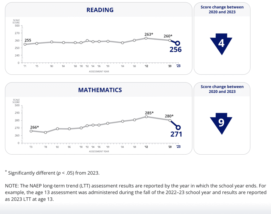 Our nation’s 8th grade NAEP scores are nearly back to where they were in 1970, having experienced a 14-point decline in math in a little over a decade and a 7-point decline in reading in the same period.