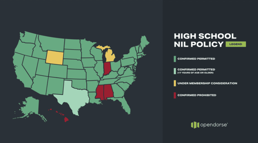 According to Opendorse, a leading athlete marketplace and NIL technology company, the vast majority of states across the U.S. now allow some form of high school NIL. Their report from November 2025 showed Alabama, Hawaii, Indiana, and Mississippi as the only states that have prohibited the practice.