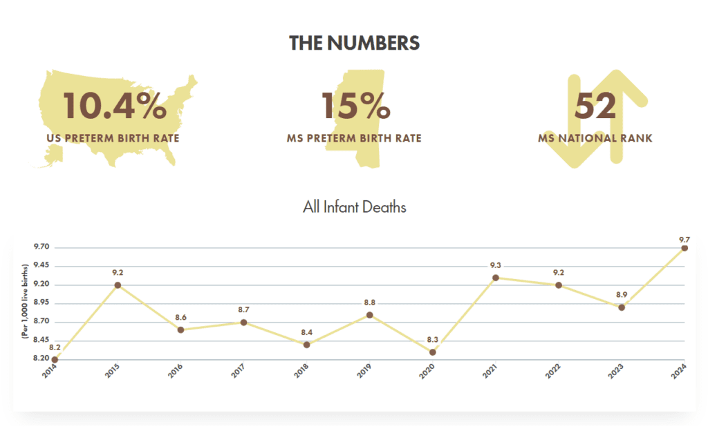 Officials with MSDH say more babies are born preterm in Mississippi than anywhere else in the nation, and that state’s infant mortality rate is significantly higher than the national average. More than 5,000 babies were born preterm in Mississippi in 2024, consistent with the 2023 rate, and the state has high rates (14.7%) of inadequate prenatal care with significant racial disparities: Babies born to black moms face a preterm birth rate of 18.5%, compared to 12.7% for white moms.