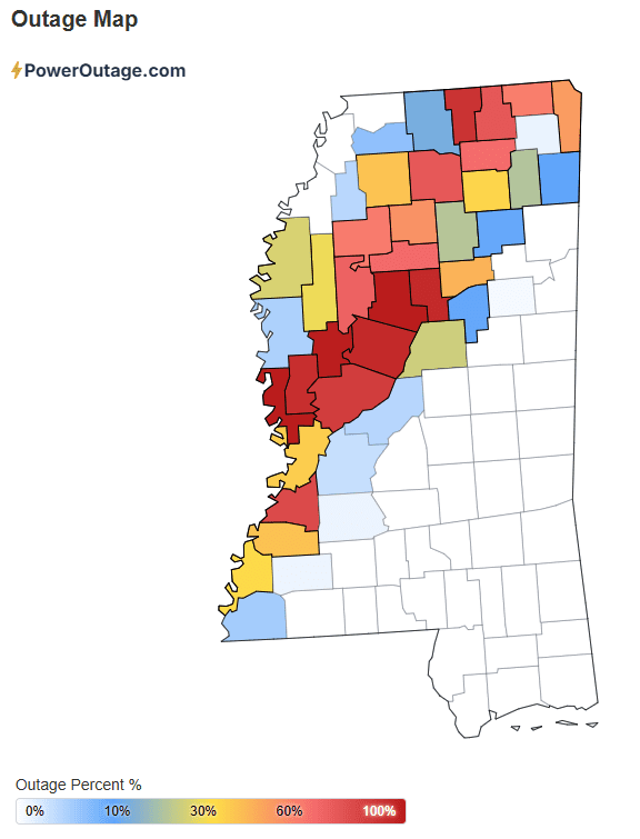 Over 157,000 locations in Mississippi remain without power Monday morning after a strong winter storm brought ice, sleet and snow to the Magnolia State, per PowerOutage.com. Lafayette County reports the highest number of outages with nearly 72% without power, followed by Alcorn and Tishomingo counties at 57% and 49%, respectively.
