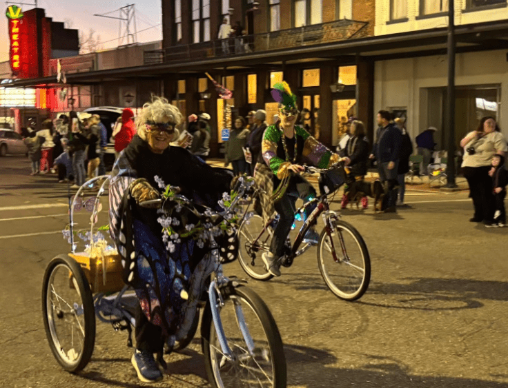 The parade rolls at 6 p.m., and last year’s crowd topped 1,200 people, with visitors coming from across North Mississippi and even Memphis. Beads fly. Moon pies arc through the air. Cups and throws scatter across outstretched hands.