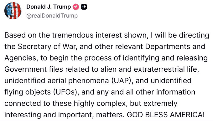 Now, on Thursday evening, Trump posted on social media that he is directing Secretary of War Pete Hegseth and other federal agencies “to begin the process of identifying and releasing” government files related to alien life, UAP and UFOs.
