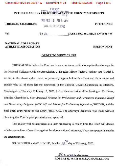 Judge Robert Whitwell has ordered the attorneys representing the NCAA in the case involving Ole Miss quarterback Trinidad Chambliss to show cause as to why they left his courtroom prior to the ruling being handed down last week.