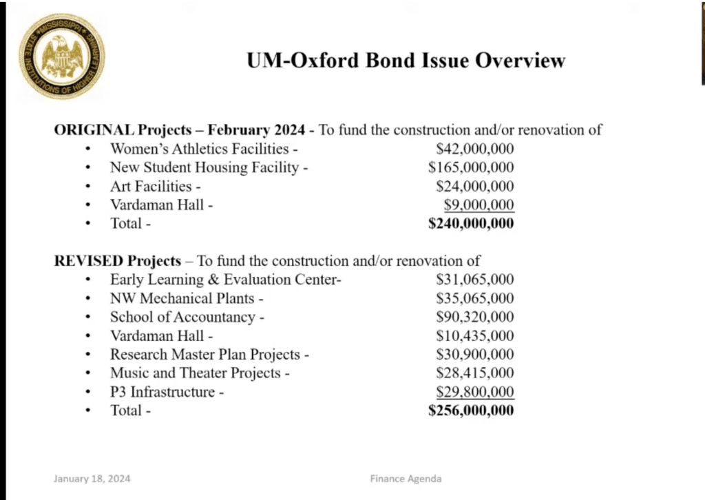 In addition, the IHL Board approved a motion to modify a bond request from Ole Miss totaling $256 million. John Pearce, senior associate commissioner for finance, said the request provides a new list of projects from a bond request approved in 2024. That previous list of projects totaled $240 million.