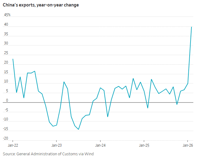 “After China’s record $1.2 trillion trade surplus in 2025, the latest numbers suggested friction is likely to continue with the U.S., Europe and other trading partners,” WSJ reported.