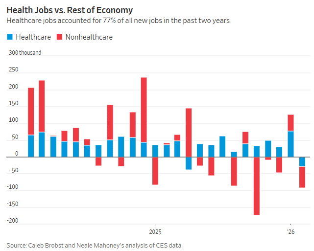 “The recent numbers tell a lopsided story. Over the past year, the U.S. has added 156,000 jobs—but healthcare alone was responsible for 375,000 new jobs. Strip out the medical sector, and the rest of the American economy is actually losing jobs,” WSJ reported. “That fragility was laid bare in February when a drop in healthcare hiring helped tip total employment into the red, shattering any illusion of broad-based growth. The dip was distorted by labor strikes, but it raises an important question: Can healthcare keep the economy healthy?”