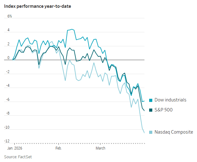 “U.S. stocks are set to deliver their worst quarter in nearly four years. The tech-heavy Nasdaq composite lurched into correction territory on March 26, meaning it had fallen 10% below its recent high,” WSJ reported. “A day later, the Dow Jones Industrial Average (a benchmark for the real economy) joined it.”
