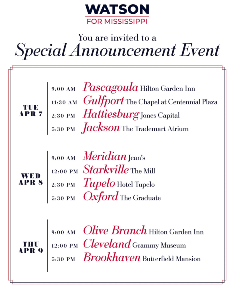 Watson will make his initial appearance and announcement Tuesday morning in Pascagoula, where he attended high school, before going to Gulfport, Hattiesburg and Jackson. Then on Wednesday, Watson will be in Meridian, Starkville, Tupelo and Oxford. Thursday, Watson has announced stops in Olive Branch, Cleveland, and Brookhaven.
