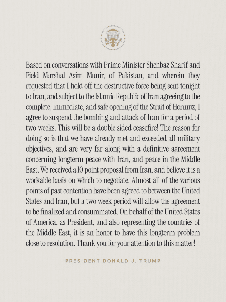 As reported by the New York Times, “The United States and Iran announced a two-week cease-fire and plans to fully reopen the Strait of Hormuz on Tuesday evening, hours before President Trump had threatened that Iran would see its ‘whole civilization’ destroyed if it did not allow free transit through the vital waterway.”