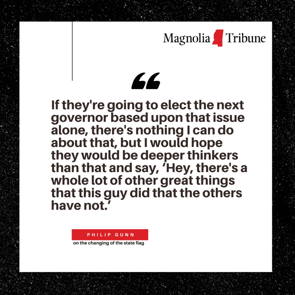 Gunn was the first prominent Republican to call for the retirement of Mississippi’s former state flag that contained the Confederate battle emblem. The flag had flown over the Magnolia State for 126 years.