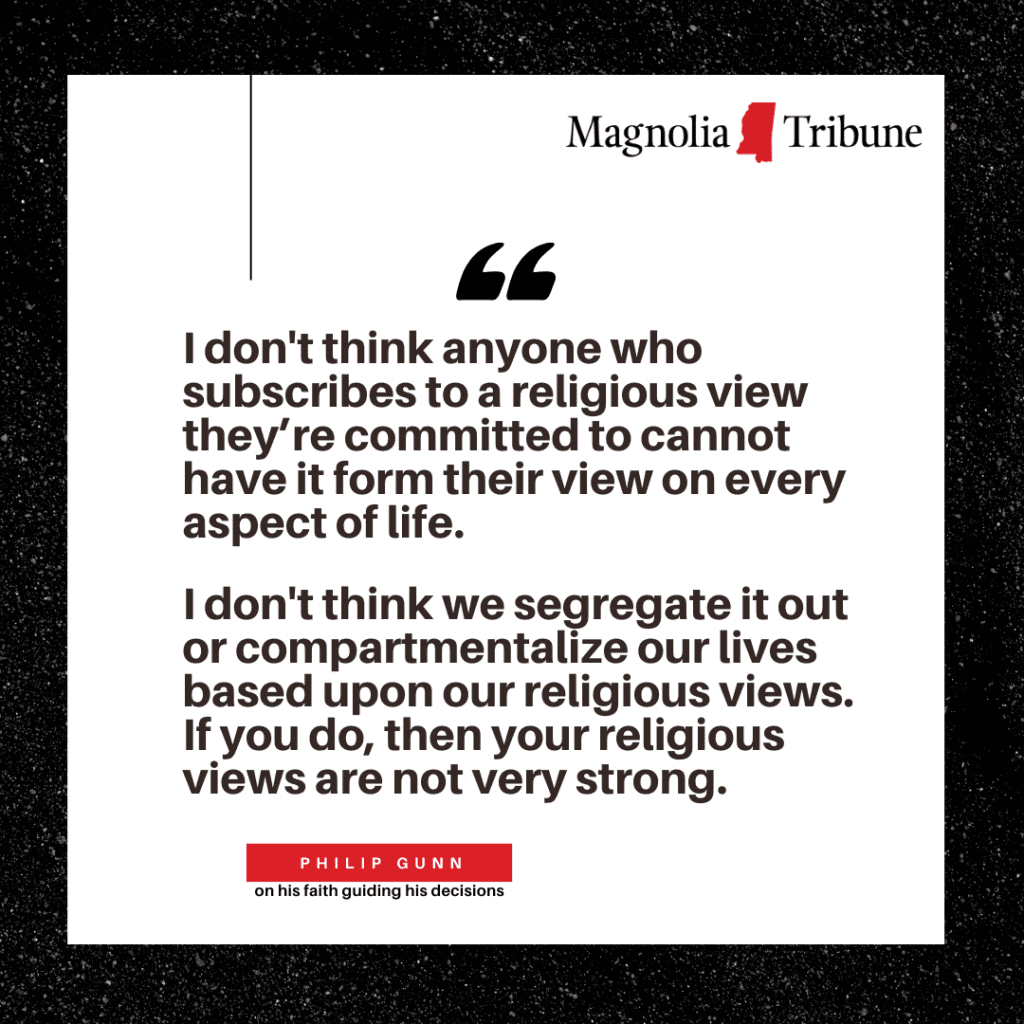 “I did an interview a while back where the host noted my being instrumental in passing the bill that overturned Roe versus Wade,” Gunn recalled. “‘What if 90% of the people didn’t agree with you on that?’ the host asked. And I said, well, that is an issue that I think is directly addressed in Scripture and I’m committed to that. I would vote still in the face of 90% being against me on that. I would still subscribe to the view that I think Scripture promotes. And when scripture speaks to it, then I’m committed to it. I strive to conduct myself in line with my religious beliefs.”