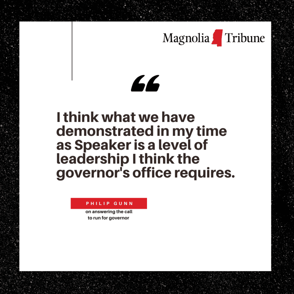 Gunn sat down for an exclusive, wide-ranging interview with Magnolia Tribune following his gubernatorial campaign announcement. He talked openly about his time as Speaker, what separates him from a potentially crowded field, and the next steps he sees in continuing to strengthen Mississippi through conservative policymaking and its implementation as the state’s chief executive.